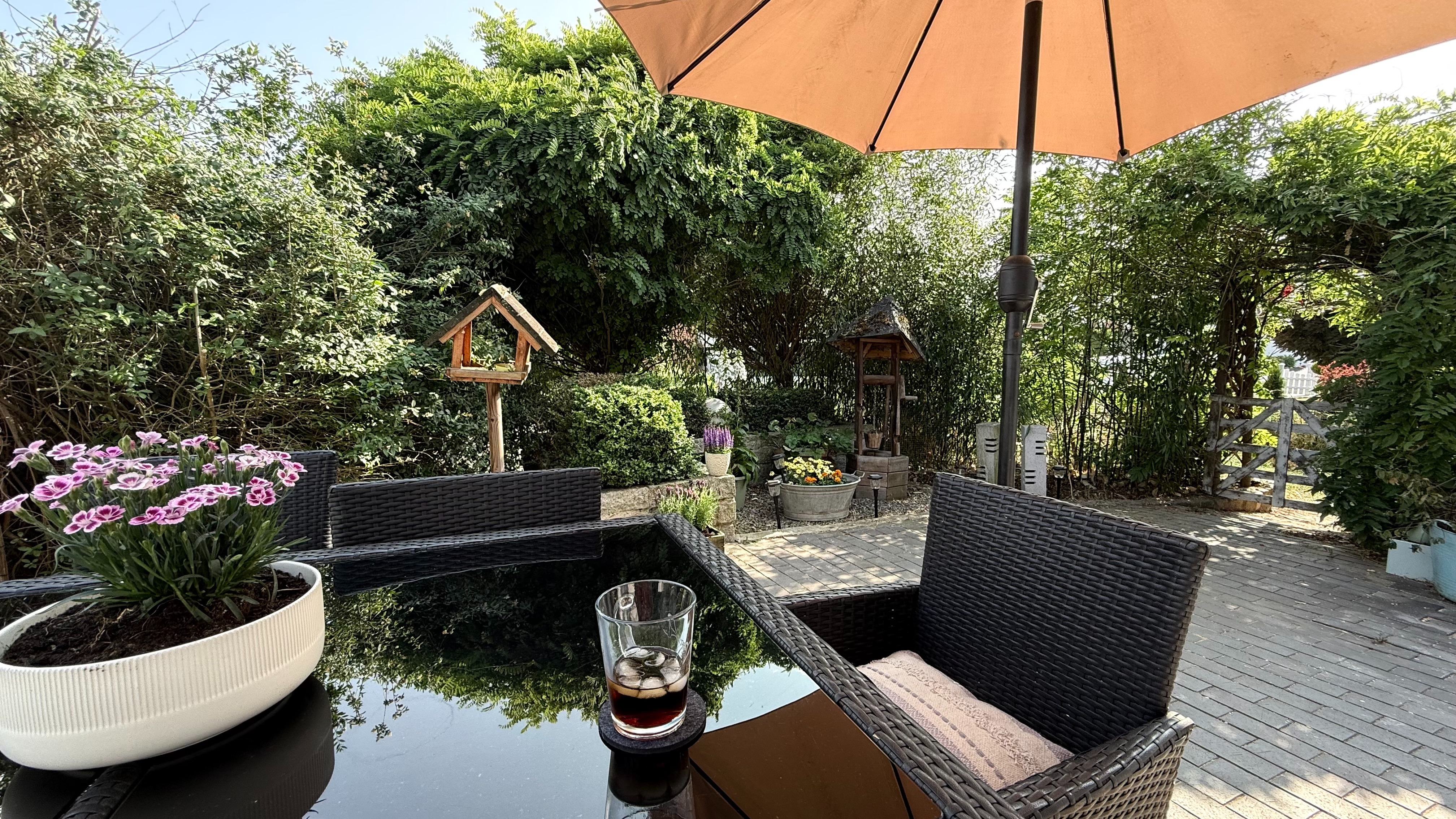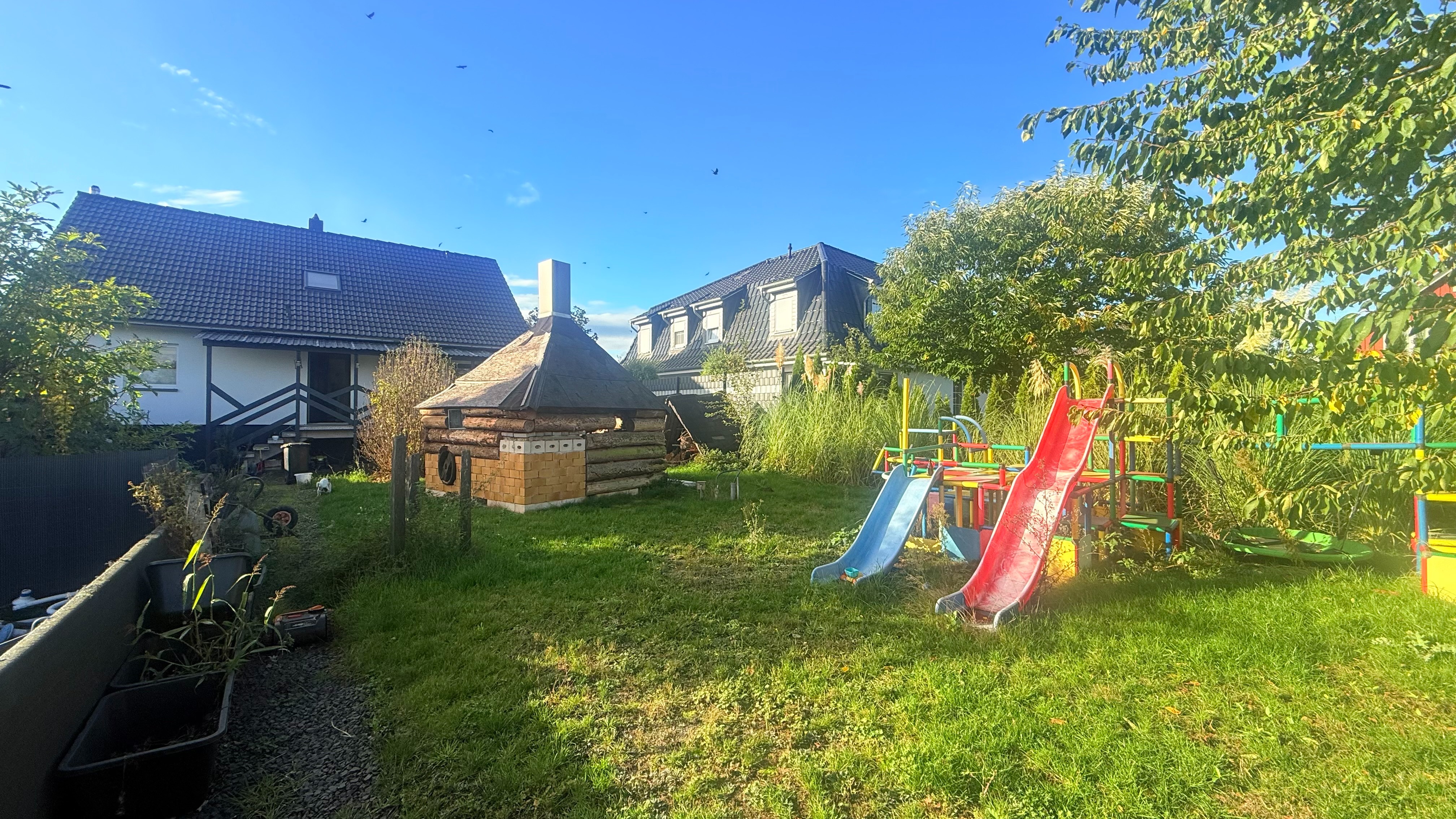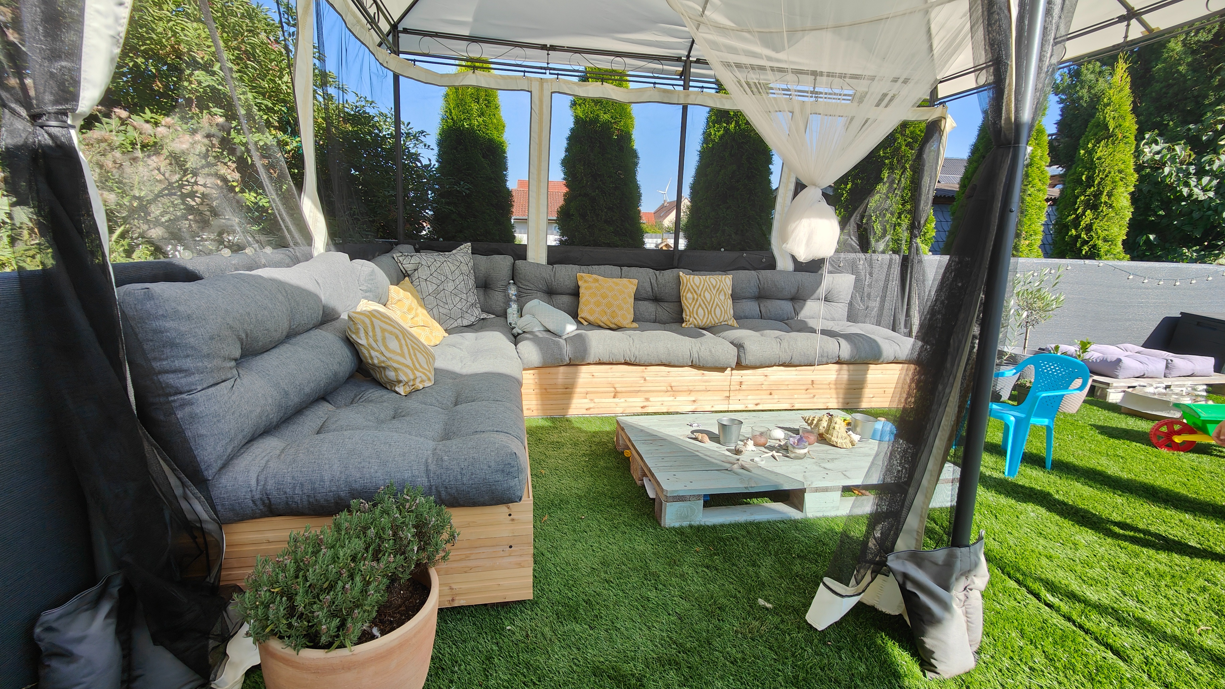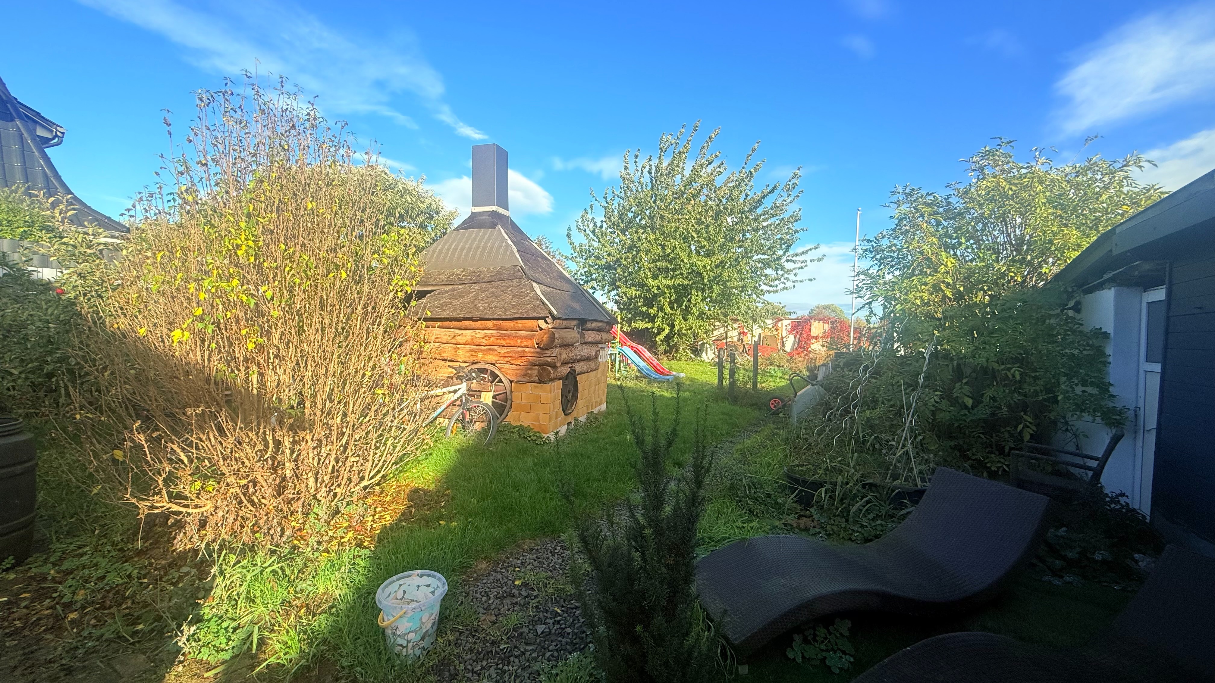 Hier gibt es eine Grillhütte für gesellige Abende, welche allerdings wieder hergerichtet werden müsste. Ein 80m² großer Lounge- / Pool- und Spielbereich wurde im hinteren Garten geschaffen.