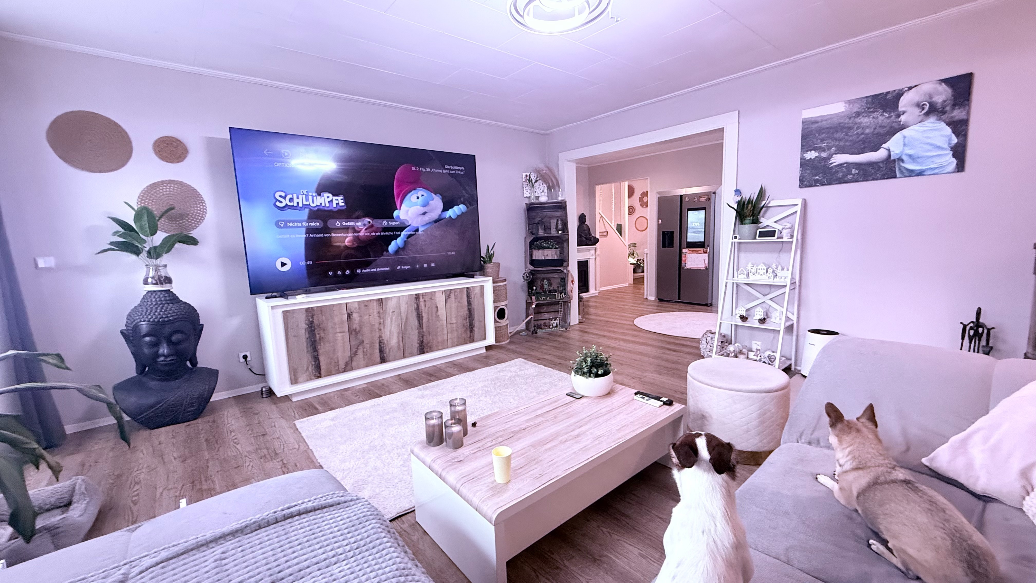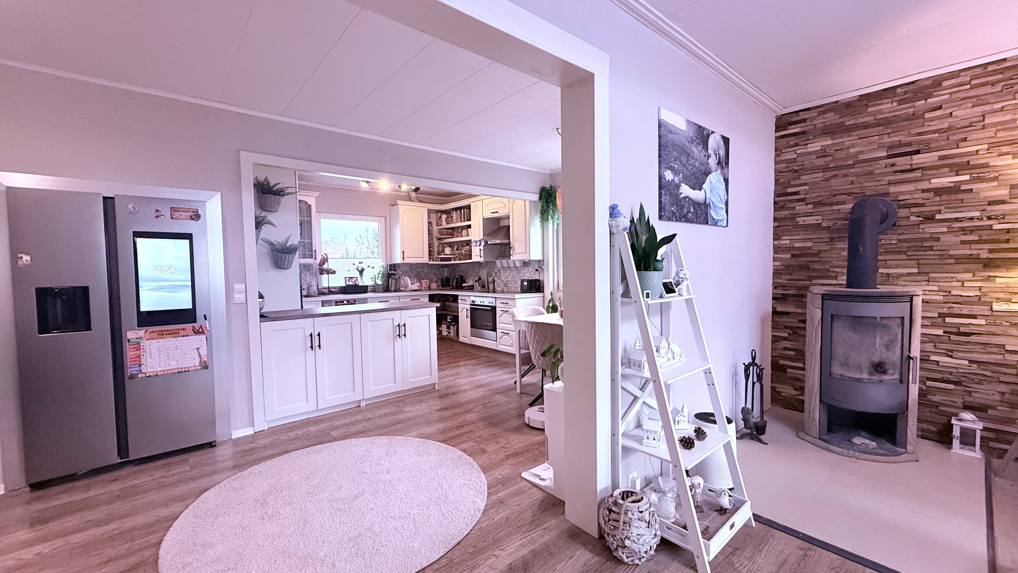 Ein besonderes Highlight im Wohnbereich ist der Kamin, der an kühleren Tagen für Gemütlichkeit und ein behagliches Wohngefühl sorgt. Die Wohnzimmerwand besteht aus Vollholz-Wandfliesen.