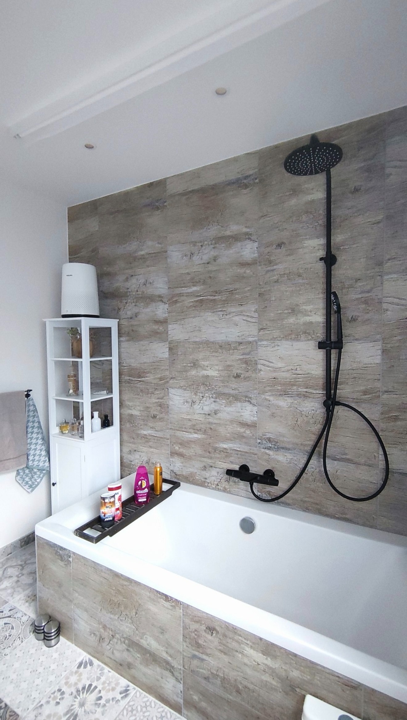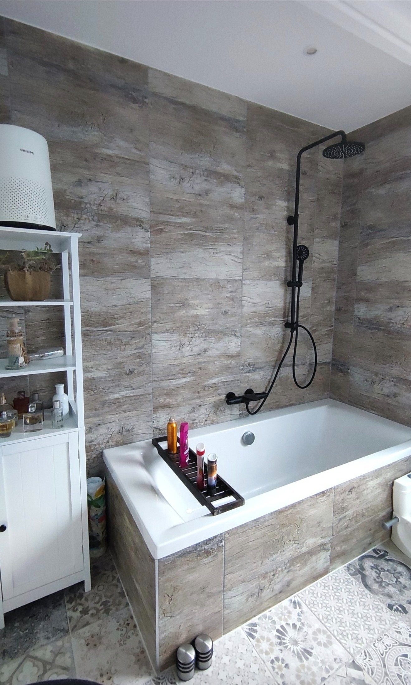 Das Badezimmer verfügt über eine XXL Badewanne, der Duschvorhang ist in der Decke integriert und wird bei Bedarf ein- oder ausgerollt. Die hochwertigen und miteinander harmonierenden Fliesen machen dieses Bad einzigartig.