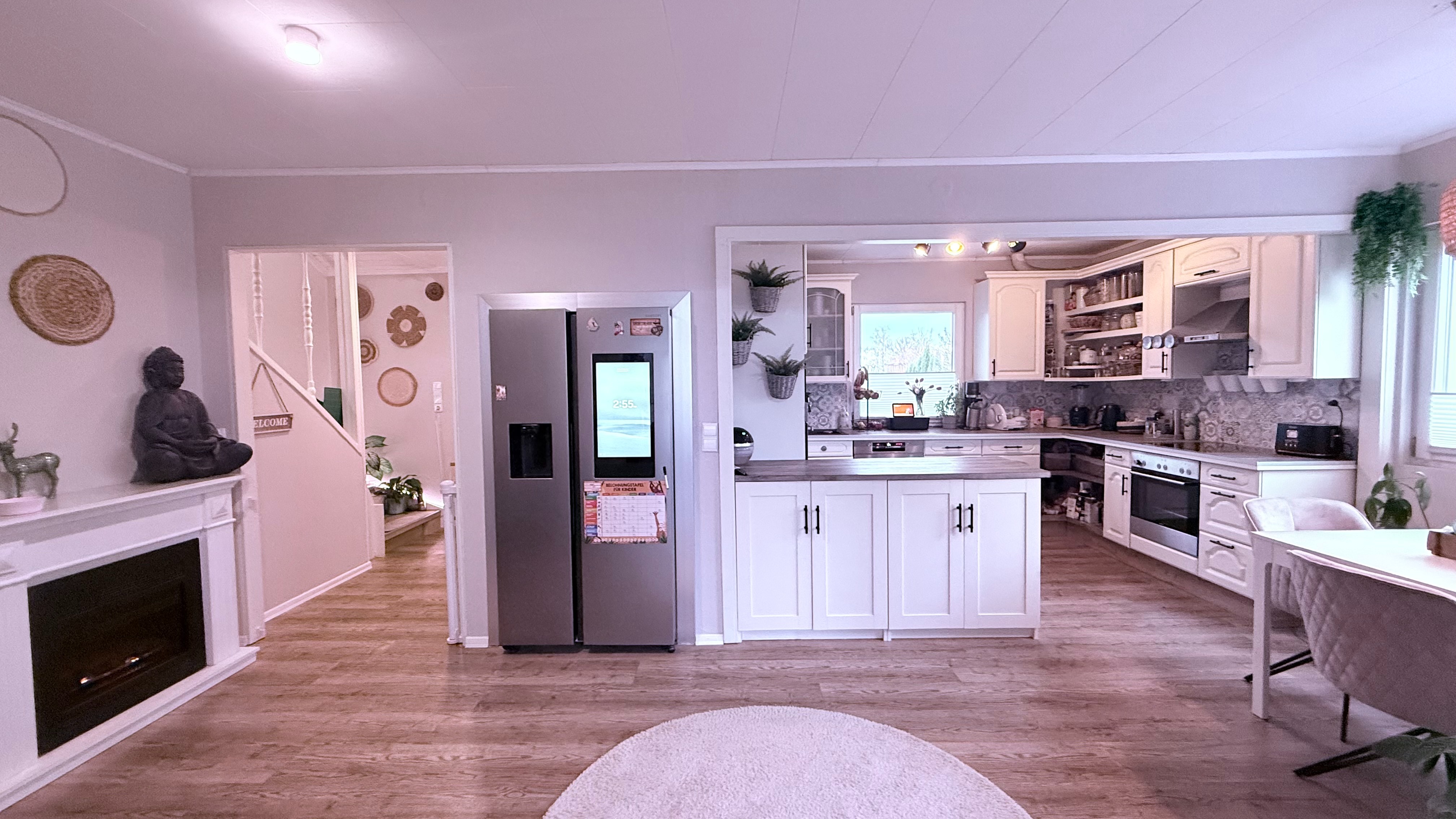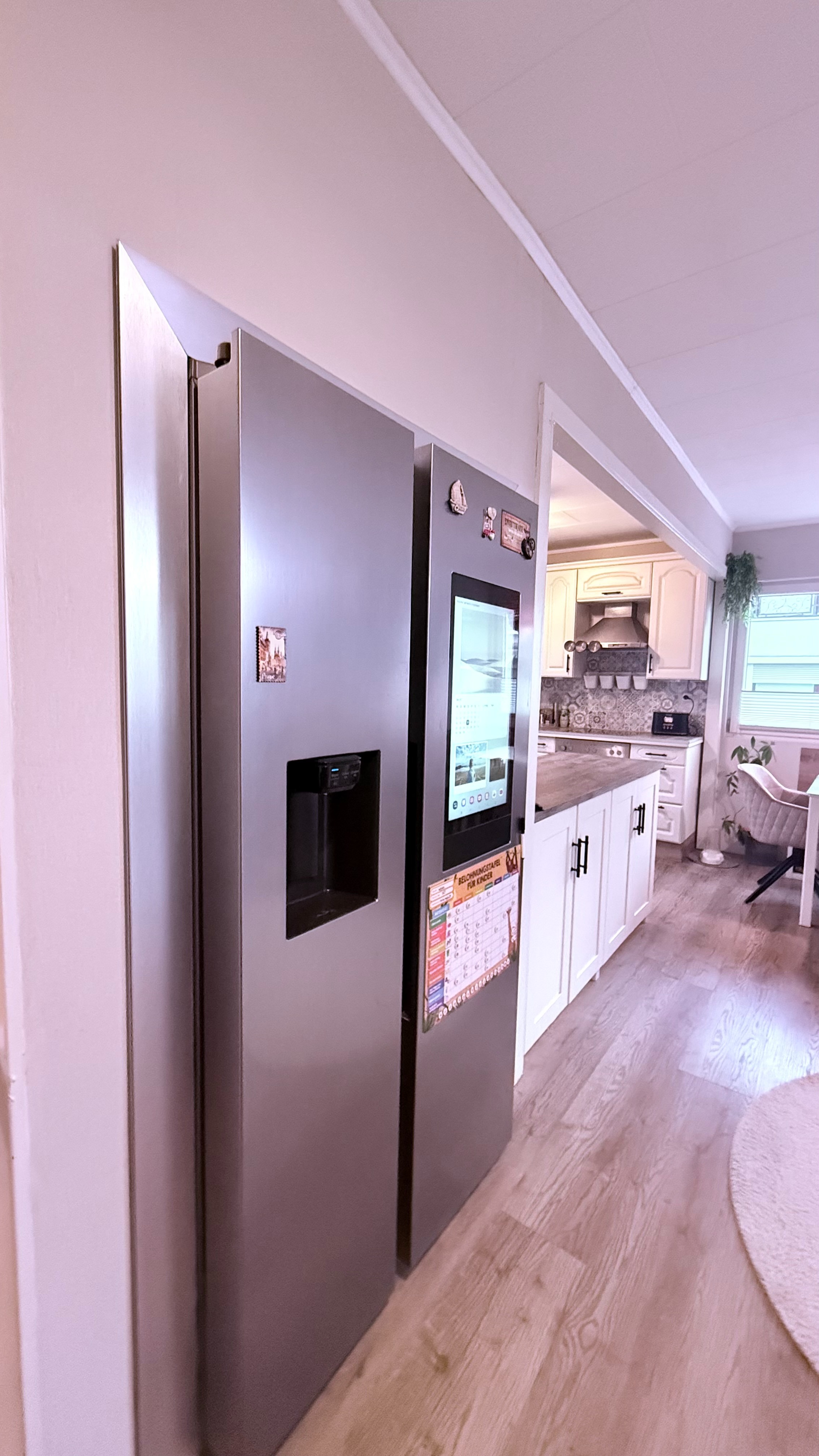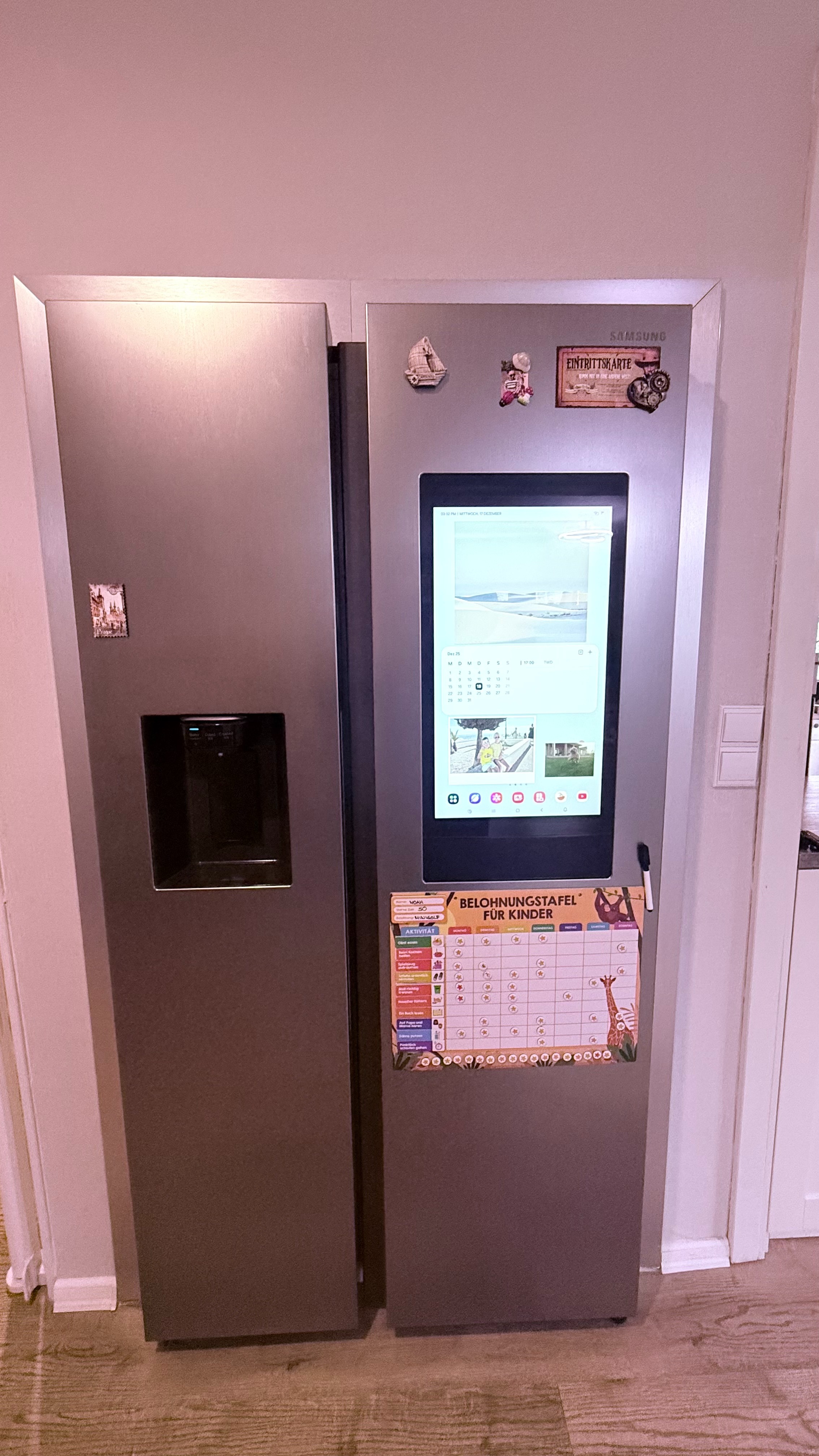Ein weiteres Highlight in der Küche ist der eingebaute Side-by-Side Kühlschrank mit Festwasseranschluss (Kühles gefiltertes Wasser, Eiswürfel und Crush-Ice) großem Display, vielen smarten Annehmlichkeiten wie z.B Kalenderfunktion, Musikausgabe, App-Steuerung wie z.B Kamera im Inneren des Kühlschranks und vielem mehr.