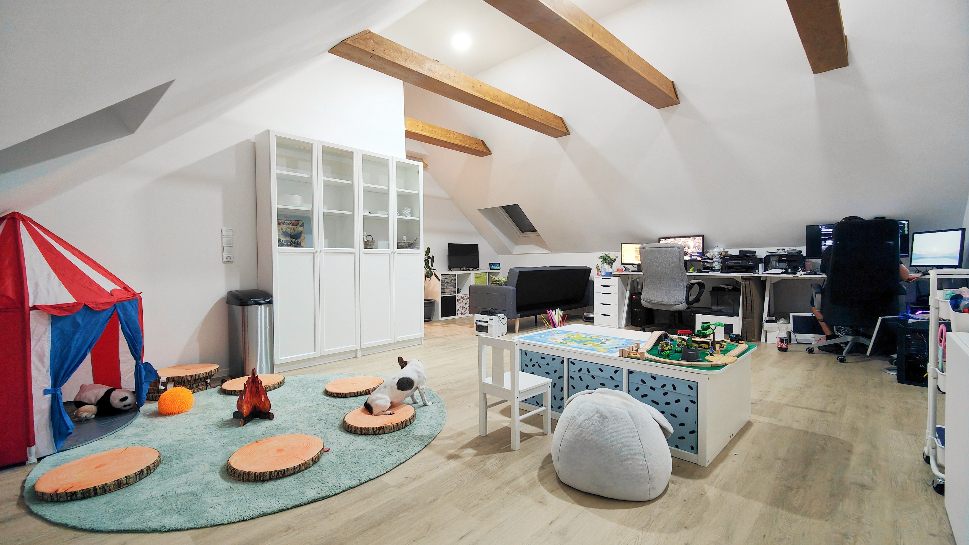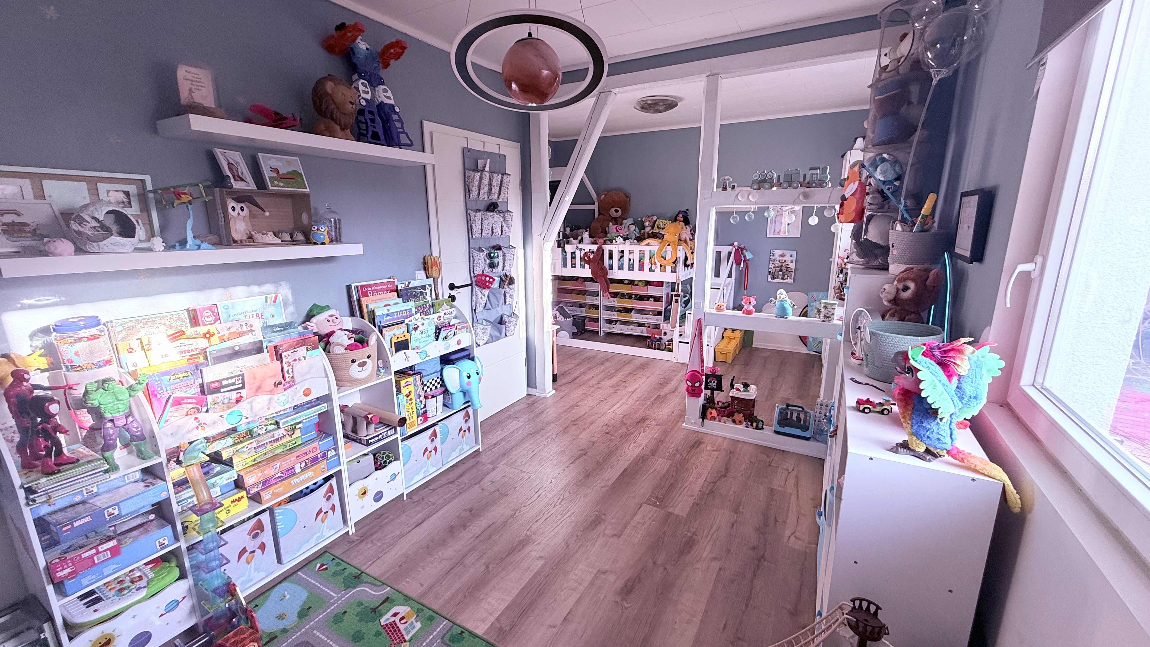 ein sehr großer, offen gestalteter Raum, aktuell genutzt als Gästezimmer, Büro und Spielzimmer in einem