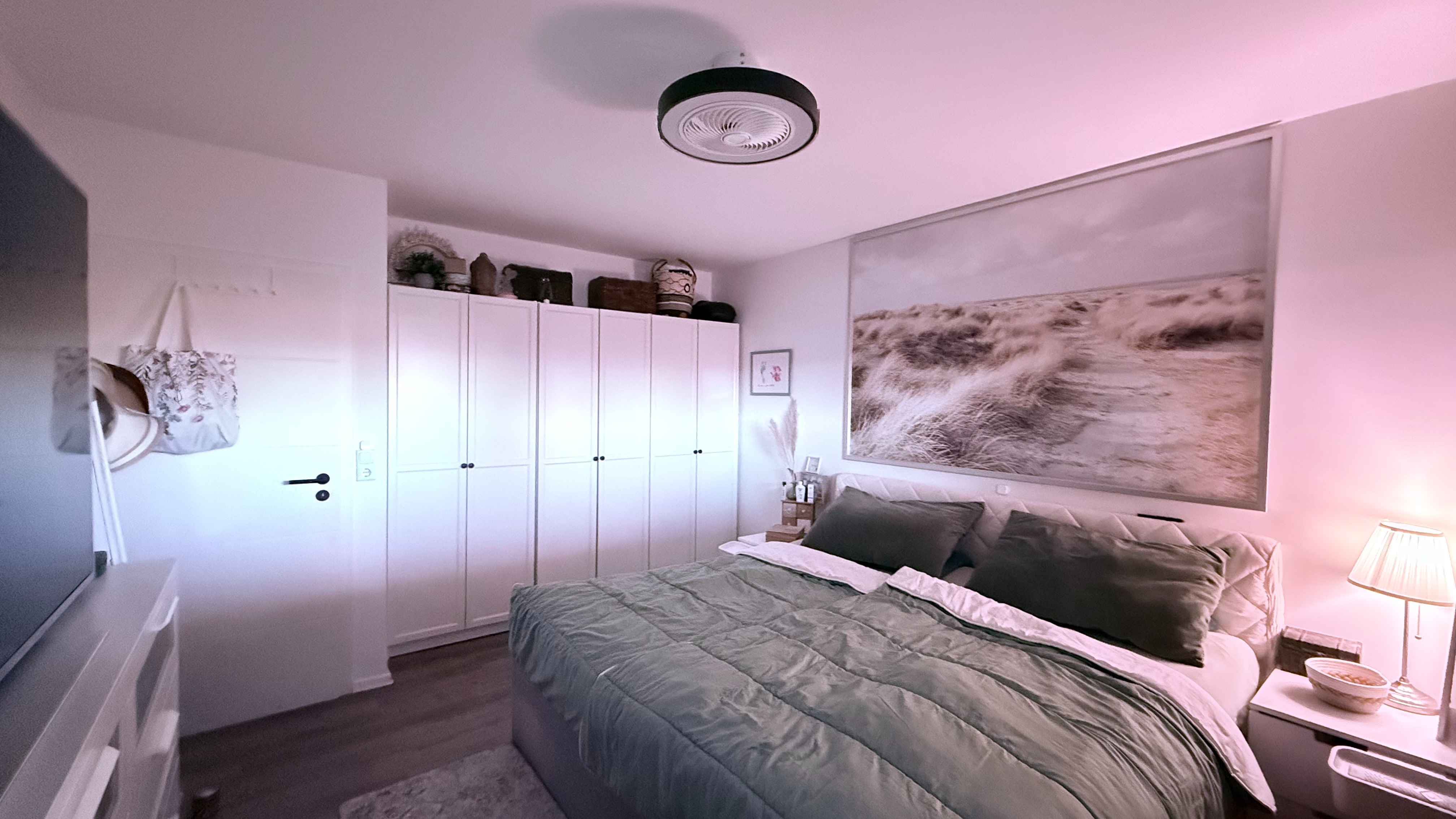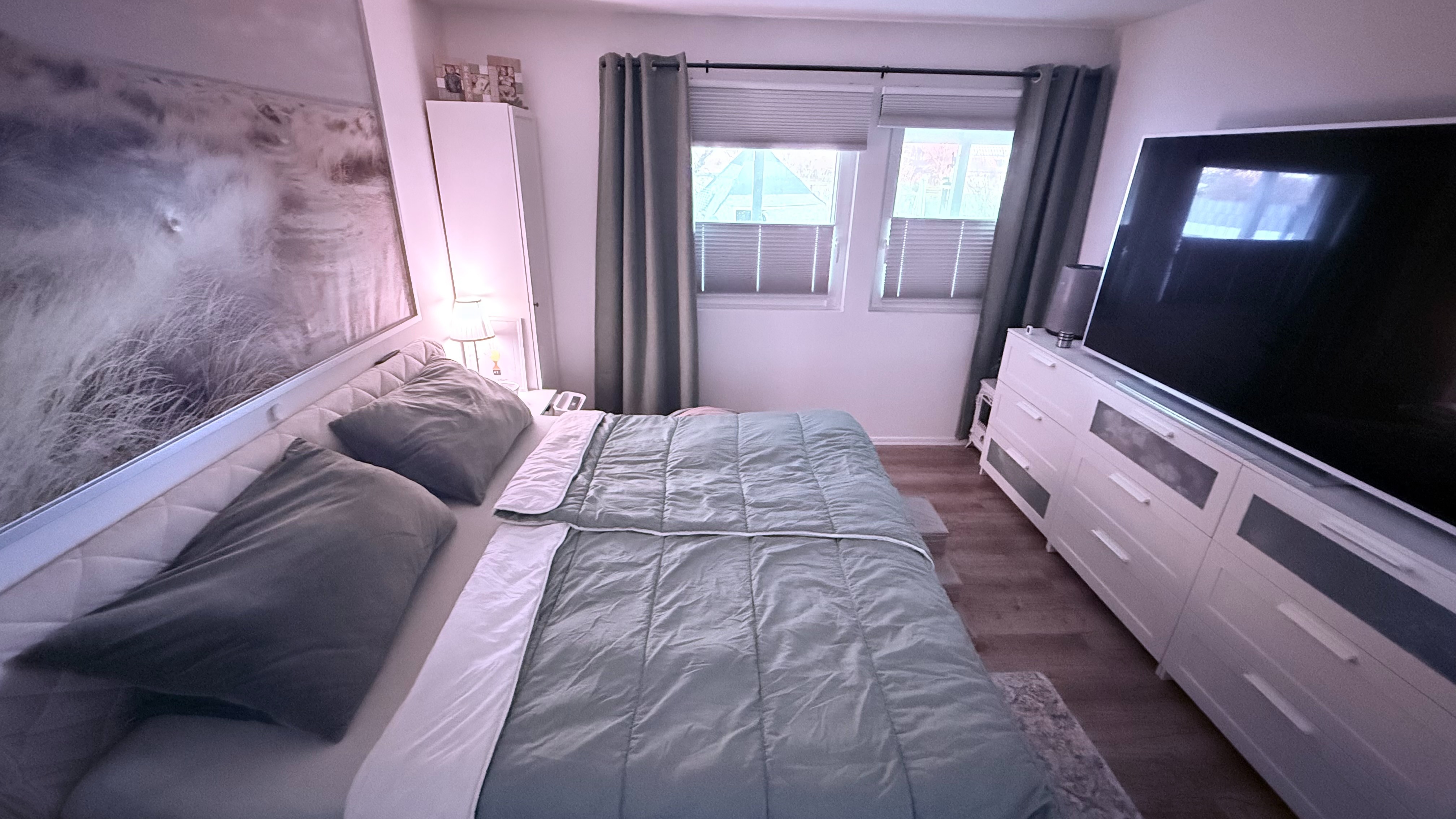 Auch im Schlafzimmer, welches genug Platz für ein King-Size Bett und einige Schränke bietet, gibt es elektrische Verdunkelungsplissees.