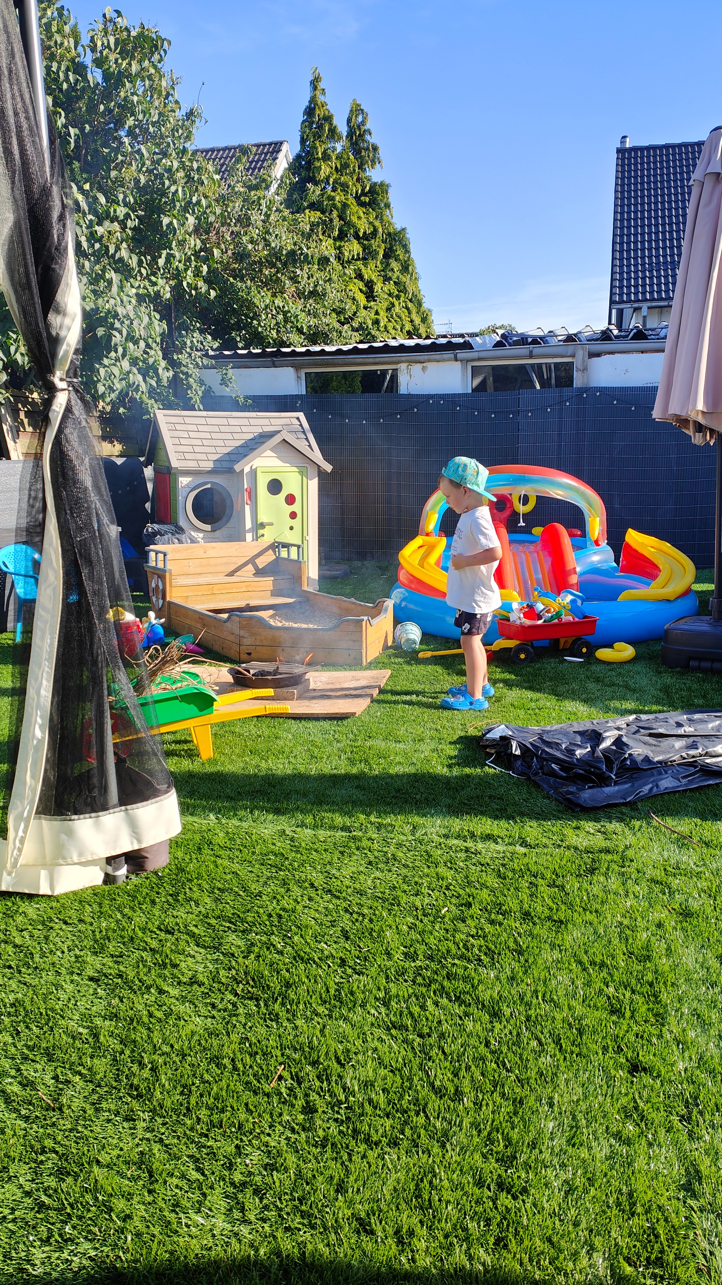 Eine große Rasenfläche ist ebenfalls vorhanden. Ein ehemaliges Entengehäge-/ Hundezwinger wurde bereits angefangen abzureißen aber noch nicht fertiggestellt.