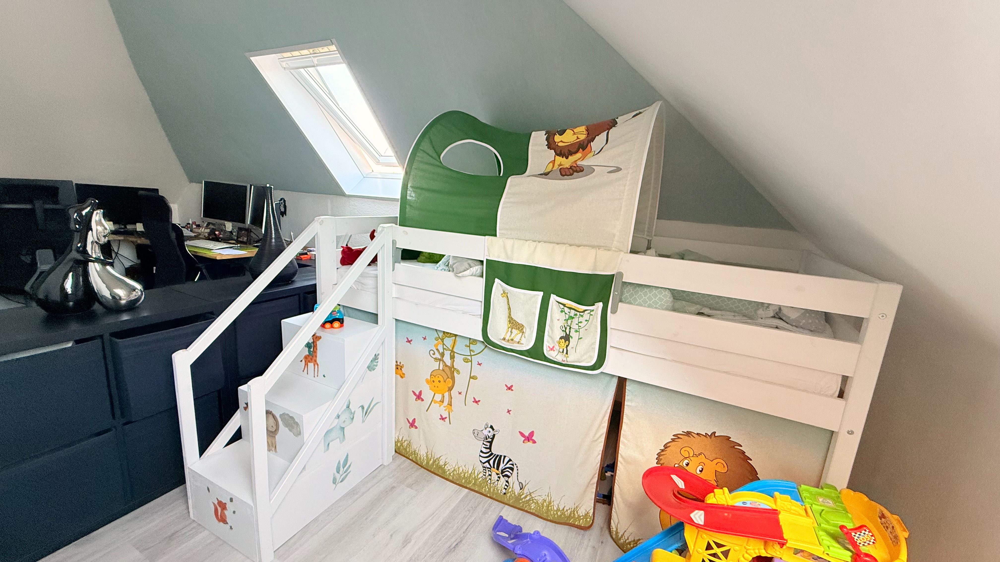 Das gesamte Dachgeschoss ist mit Velux Dachfenstern ausgestattet. Angepasste Plissees gibt es im Schlafzimmer und im Büro.