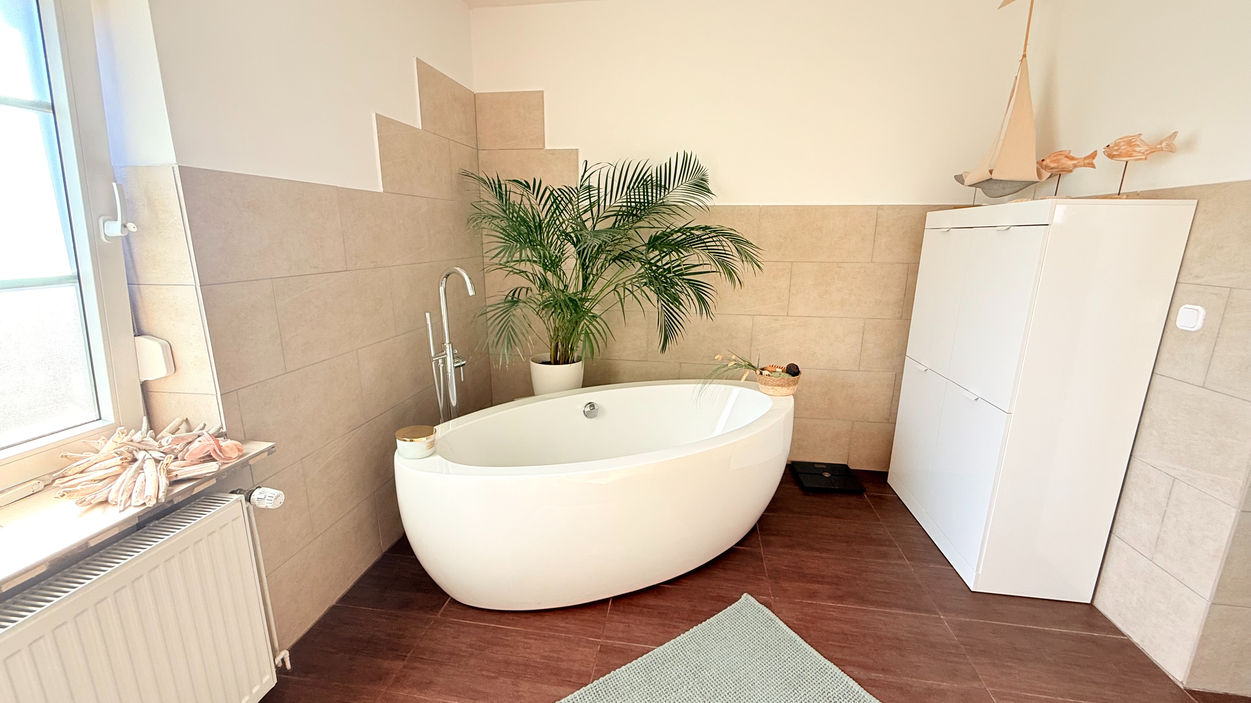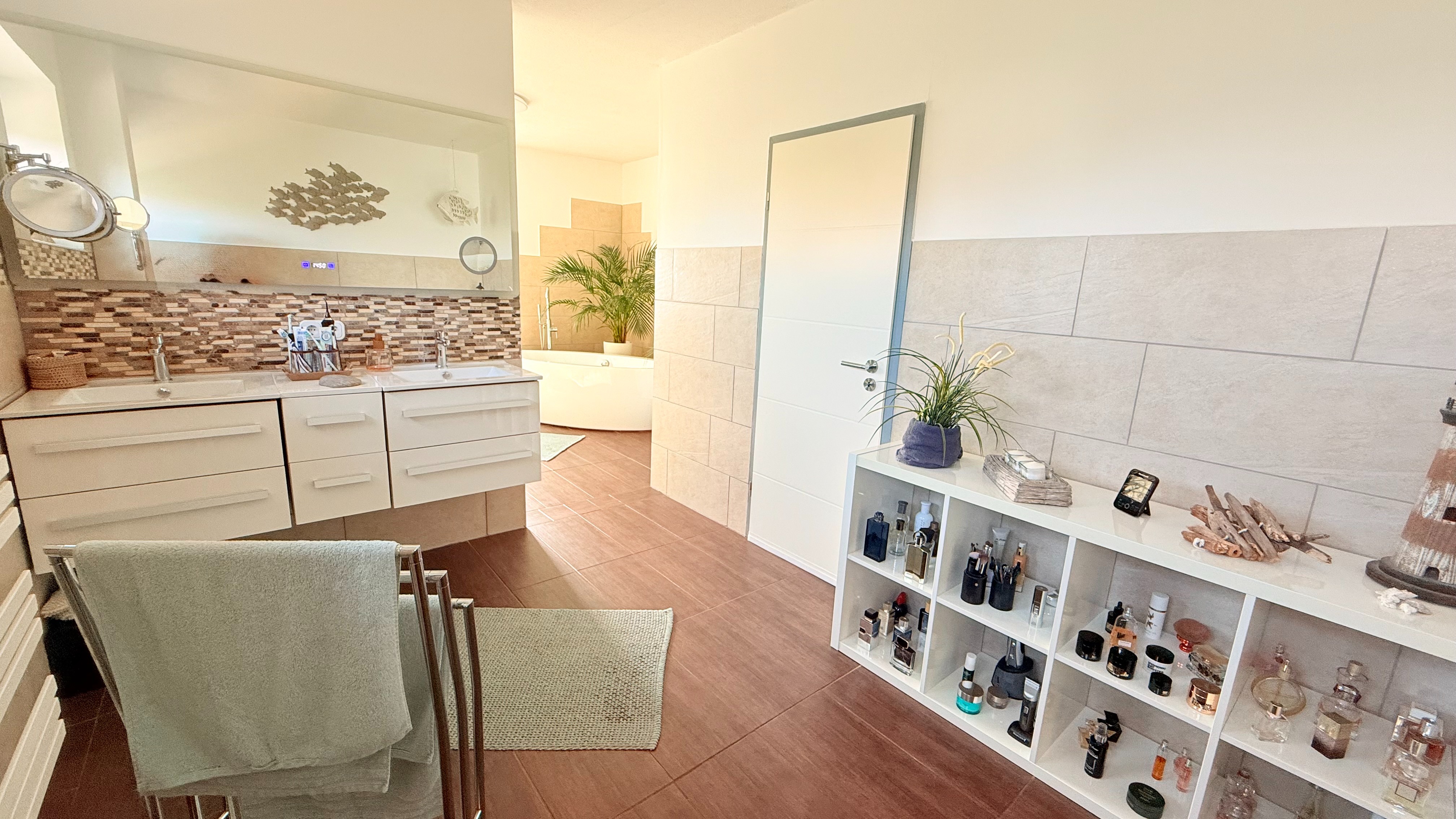 Das Badezimmer besticht durch seine außergewöhnliche Größe und dem modern-mediterranen Look. Ausgestattet mit einem Doppelwaschbecken, einem großen LED-Touch-Spiegel, einer ebenerdigen XXL-Dusche und einer freistehenden Badewanne lässt dieses Bad keine Wünsche offen.