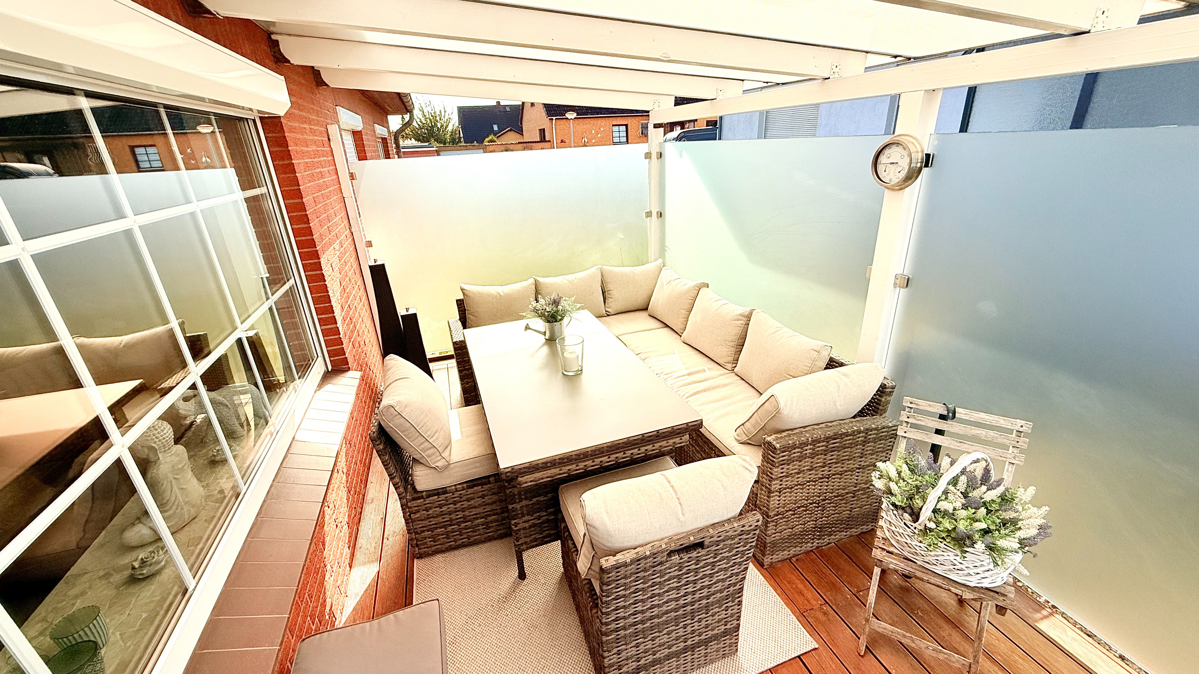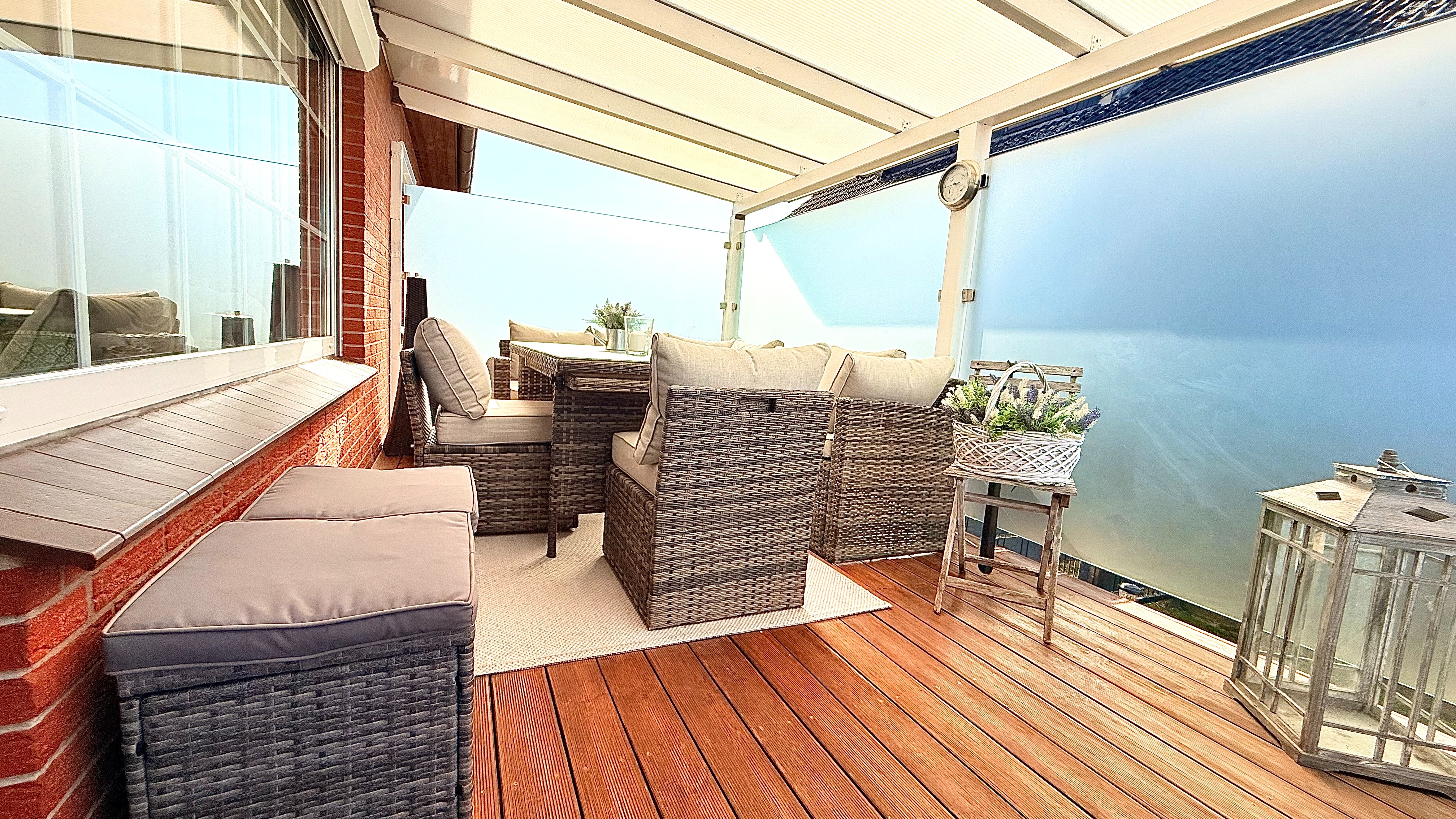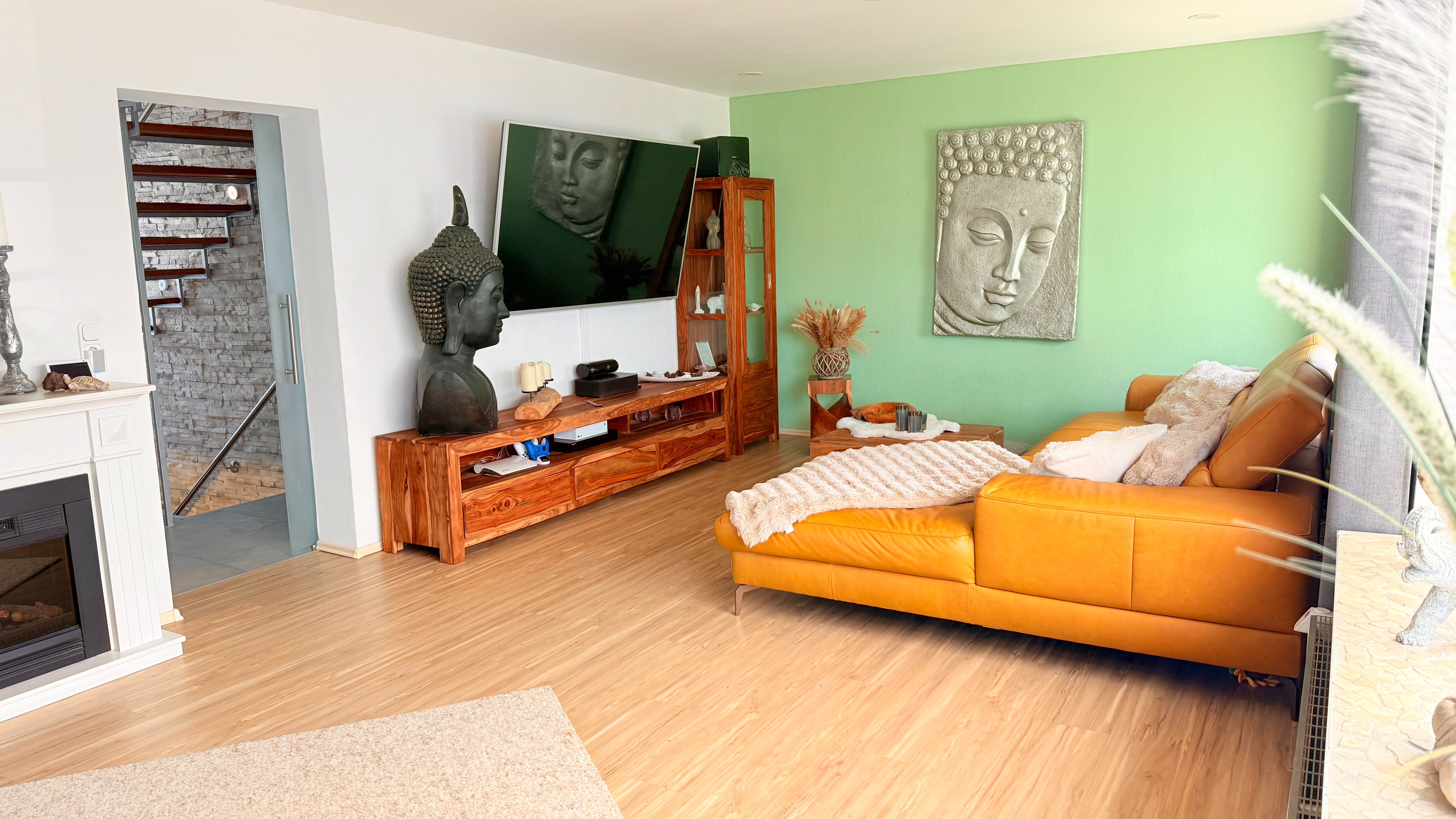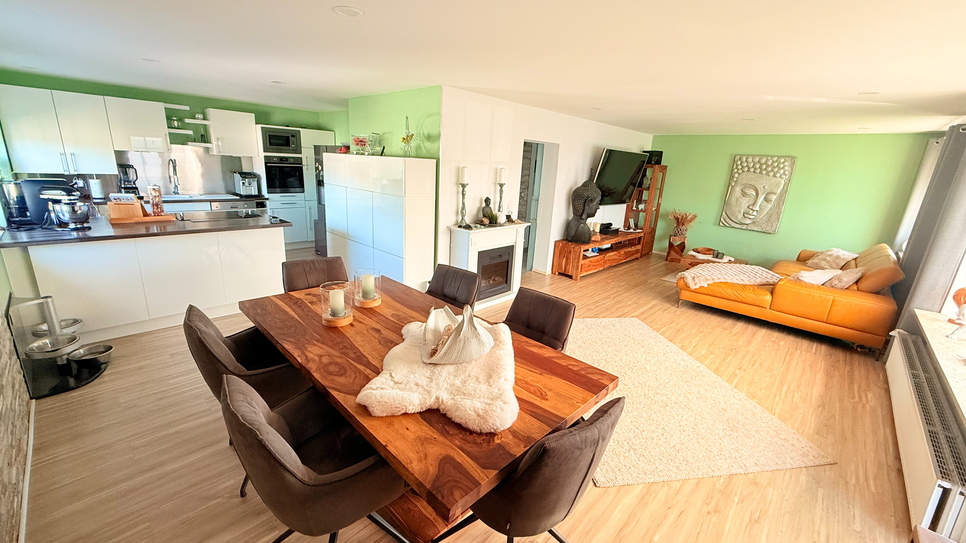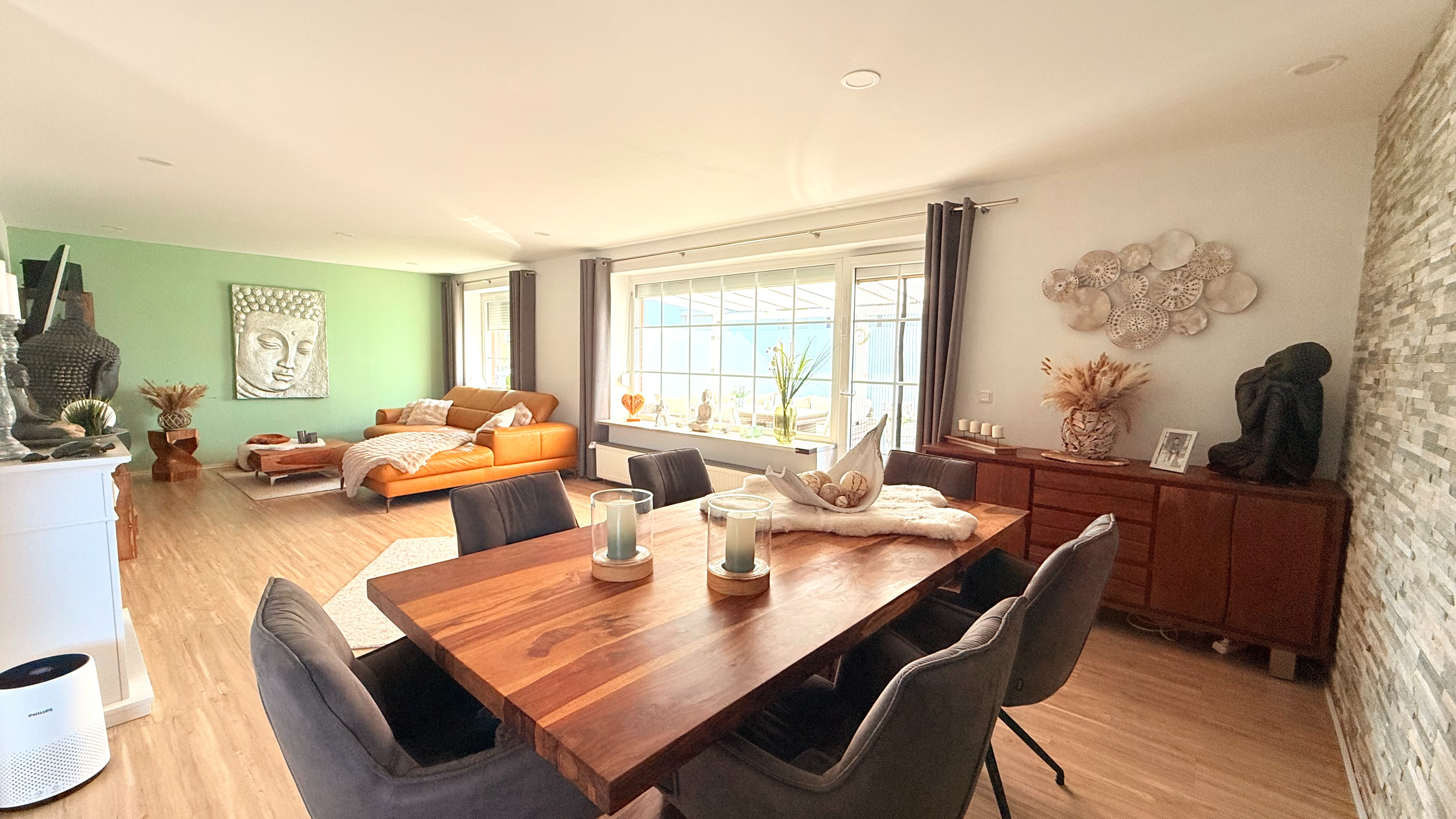 Die Essecke bietet Platz für einen großen Esstisch, an dem man viele gesellige Abende verbringen kann. Die hochwertige und beleuchtete Natursteinwand ist hier ein echtes Highlight. Von hieraus haben Sie direkten Zugang auf die große Terrasse. Besonders hell ist der gesamte Wohn-/Essbereich dank des großen innenliegenden Sprossenfensters. Eine Glasschiebetür rundet das Bild ab.