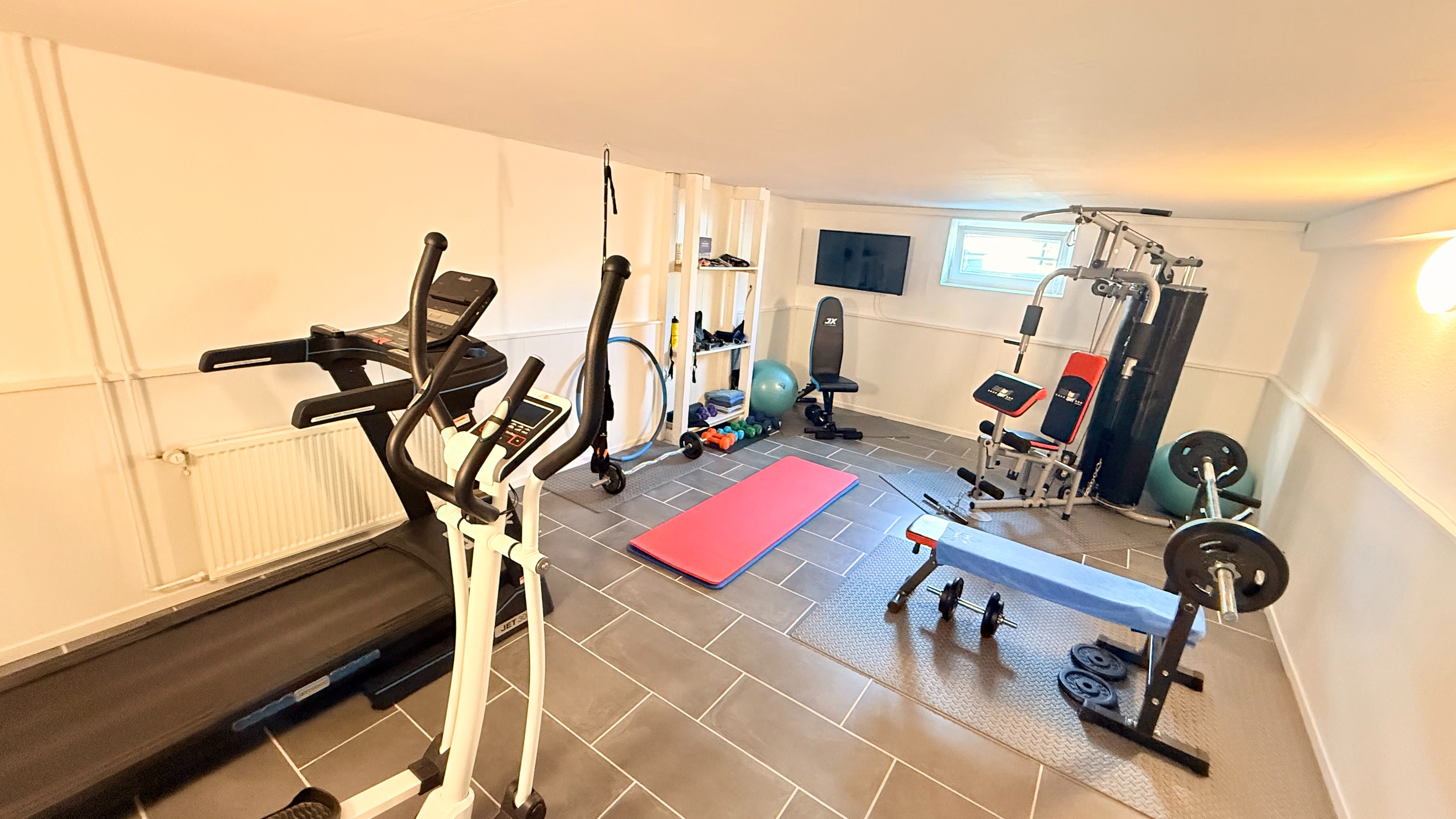 Im Keller befindet sich ein neu gefliester atemberaubender Fitnessraum.