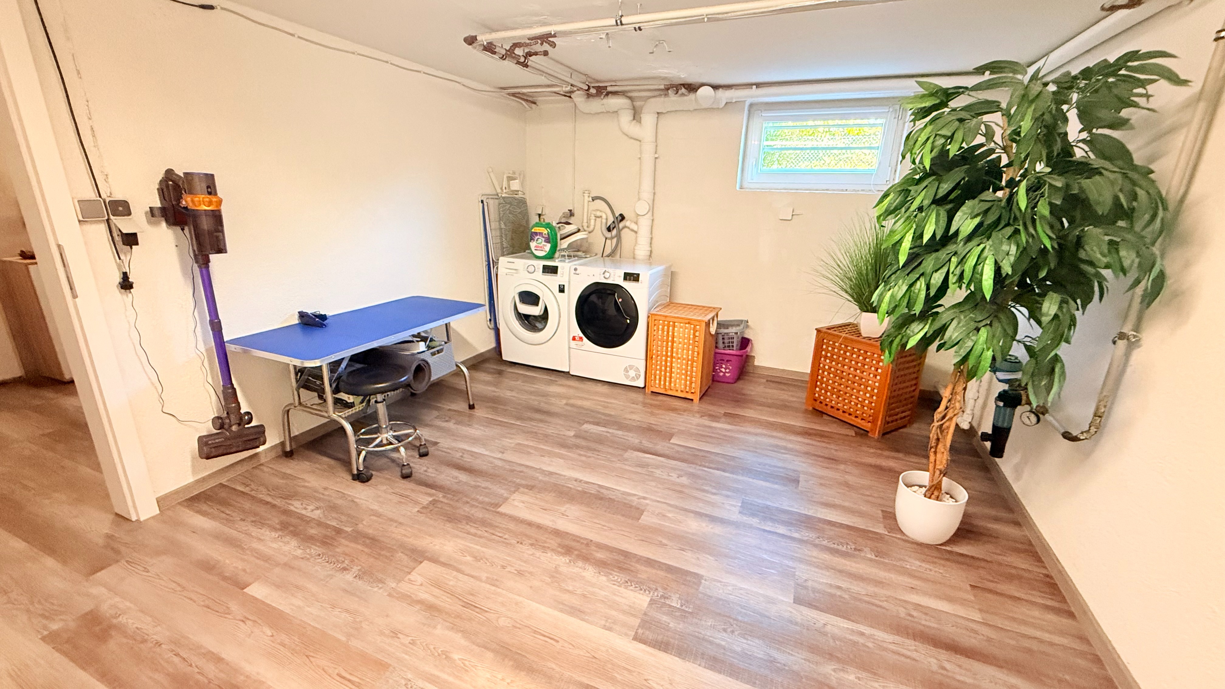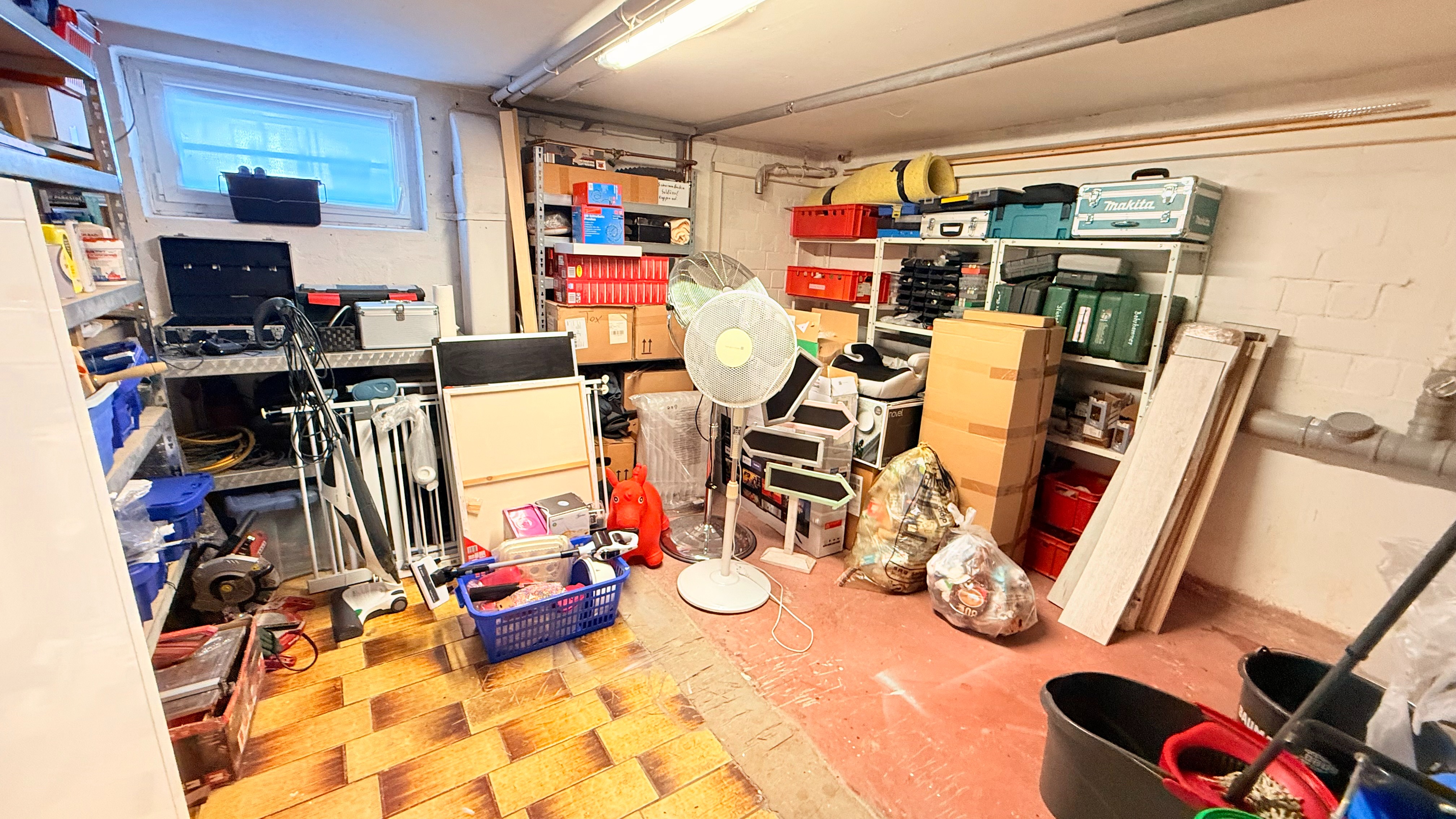 Des weiteren befinden sich ein großer Vorratsraum/Abstellraum mit Schwerlastregalen im Keller, sowie der Heizungsraum und ein Waschraum. Ein Teil des Kellers ist mit Designbelag Nutzungsklasse 64 ausgelegt.