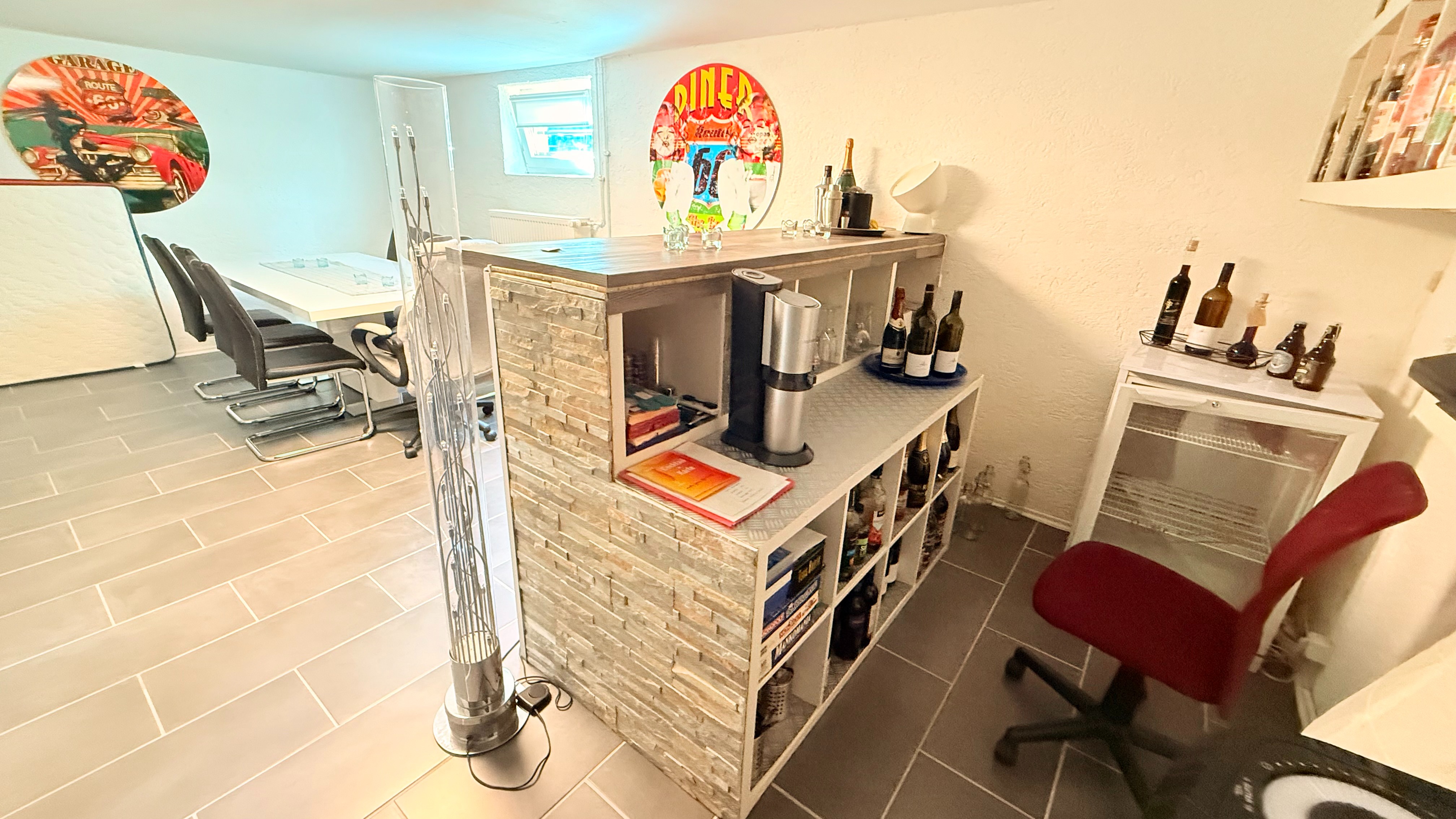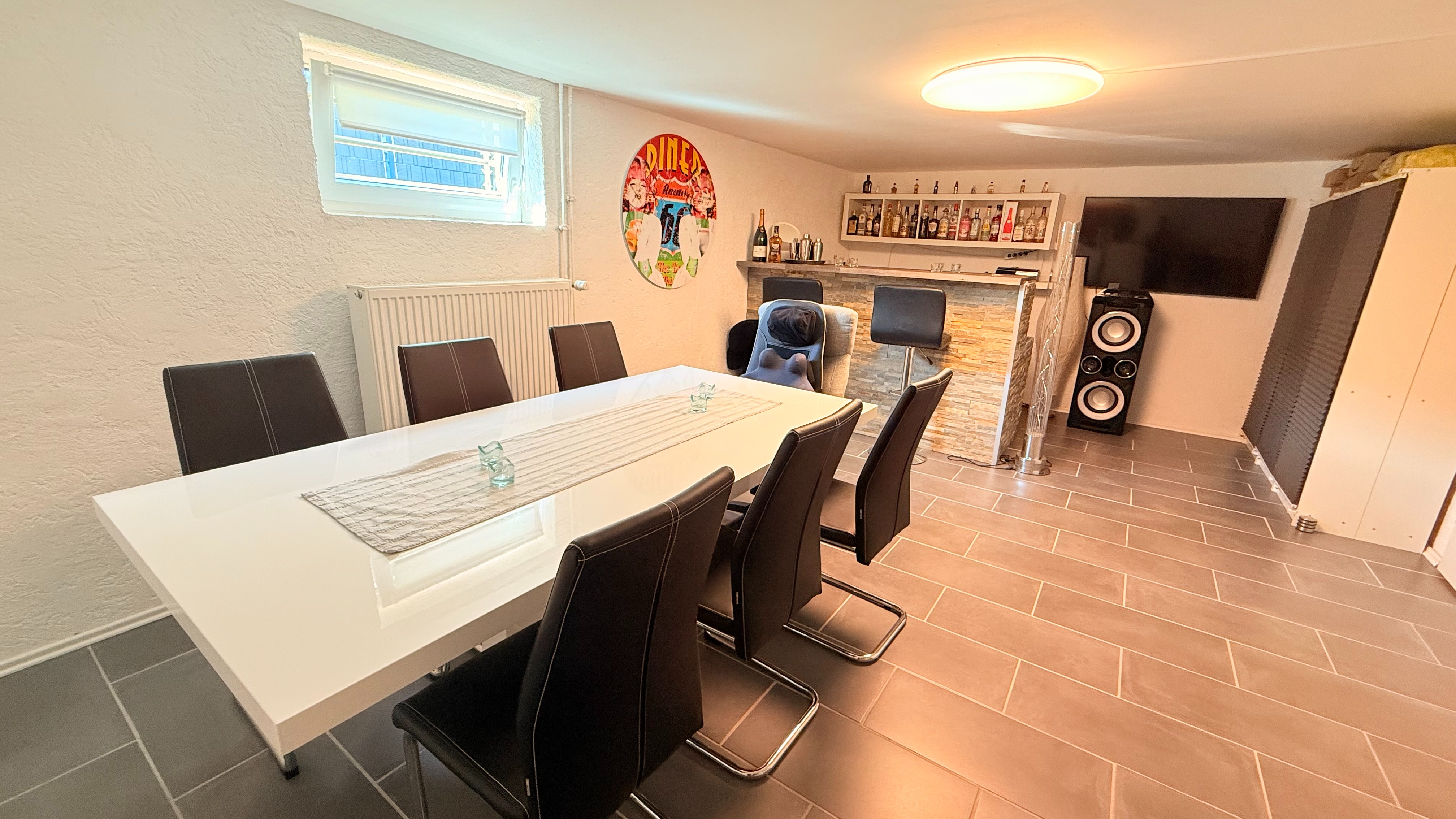 Ein weiteres Highlight ist der ebenfalls neu geflieste Partyraum. Hier ist genug Platz für eine lange Tafel, einen Tanzbereich und die Bar mit Kühlschrank, welche viel Stauraum für Getränke und Gläser bietet.Auf Wunsch kann auch hier alles übernommen werden.