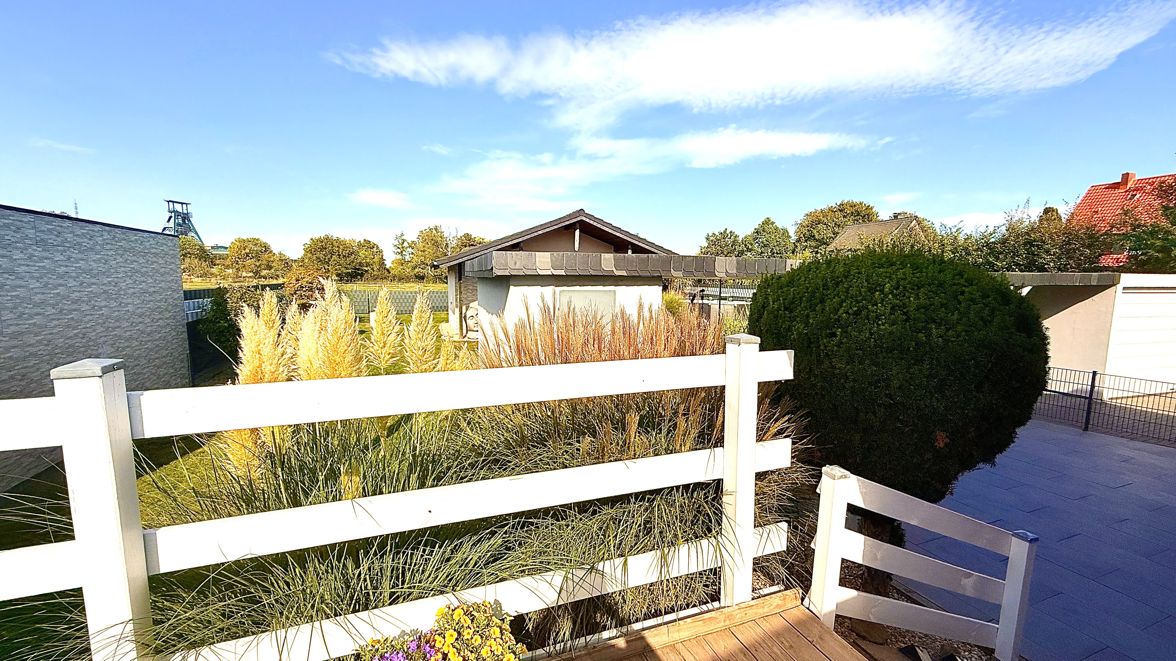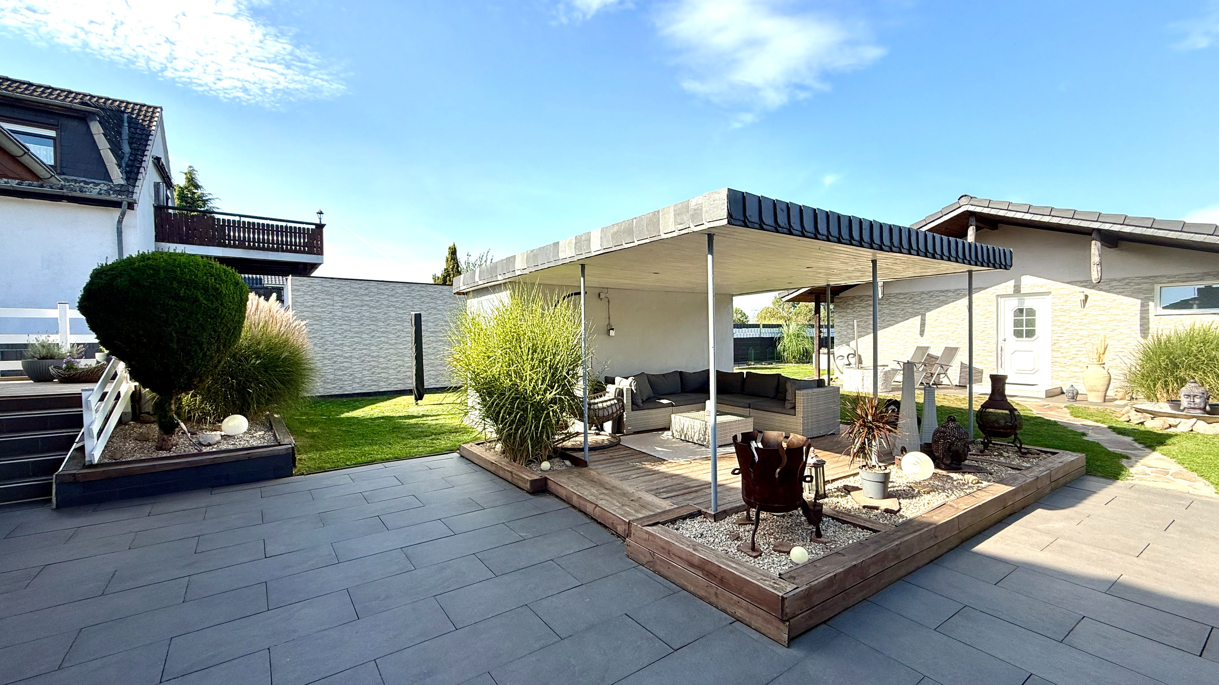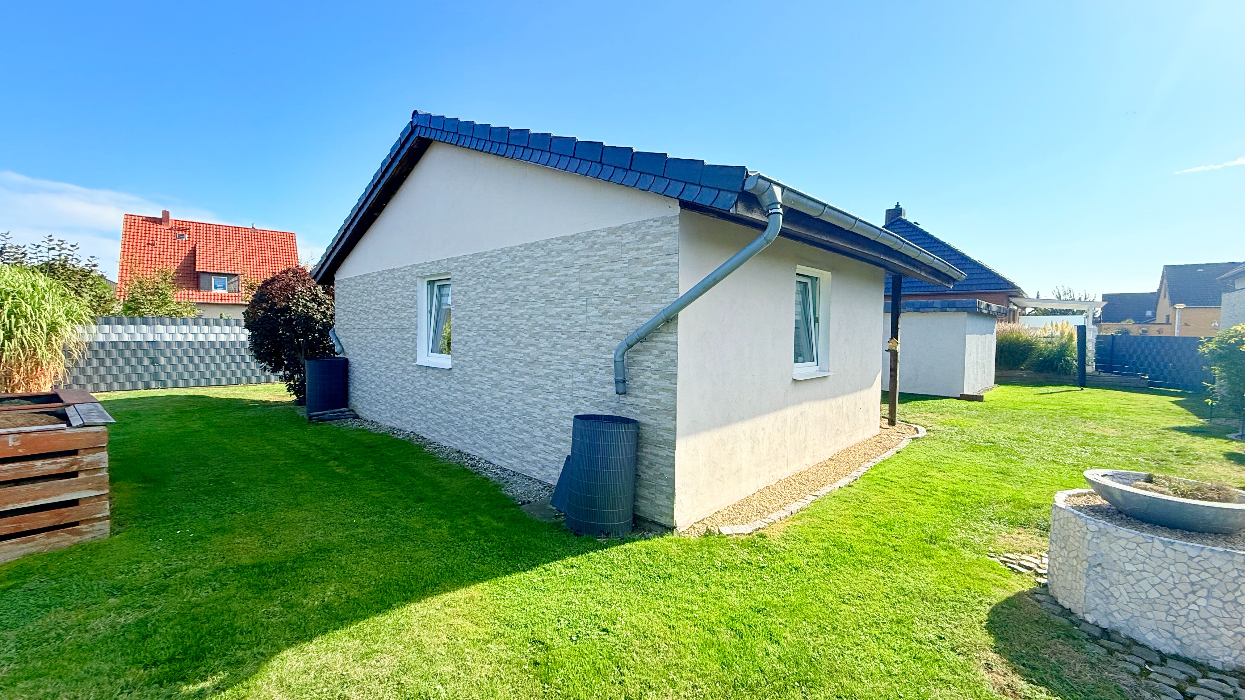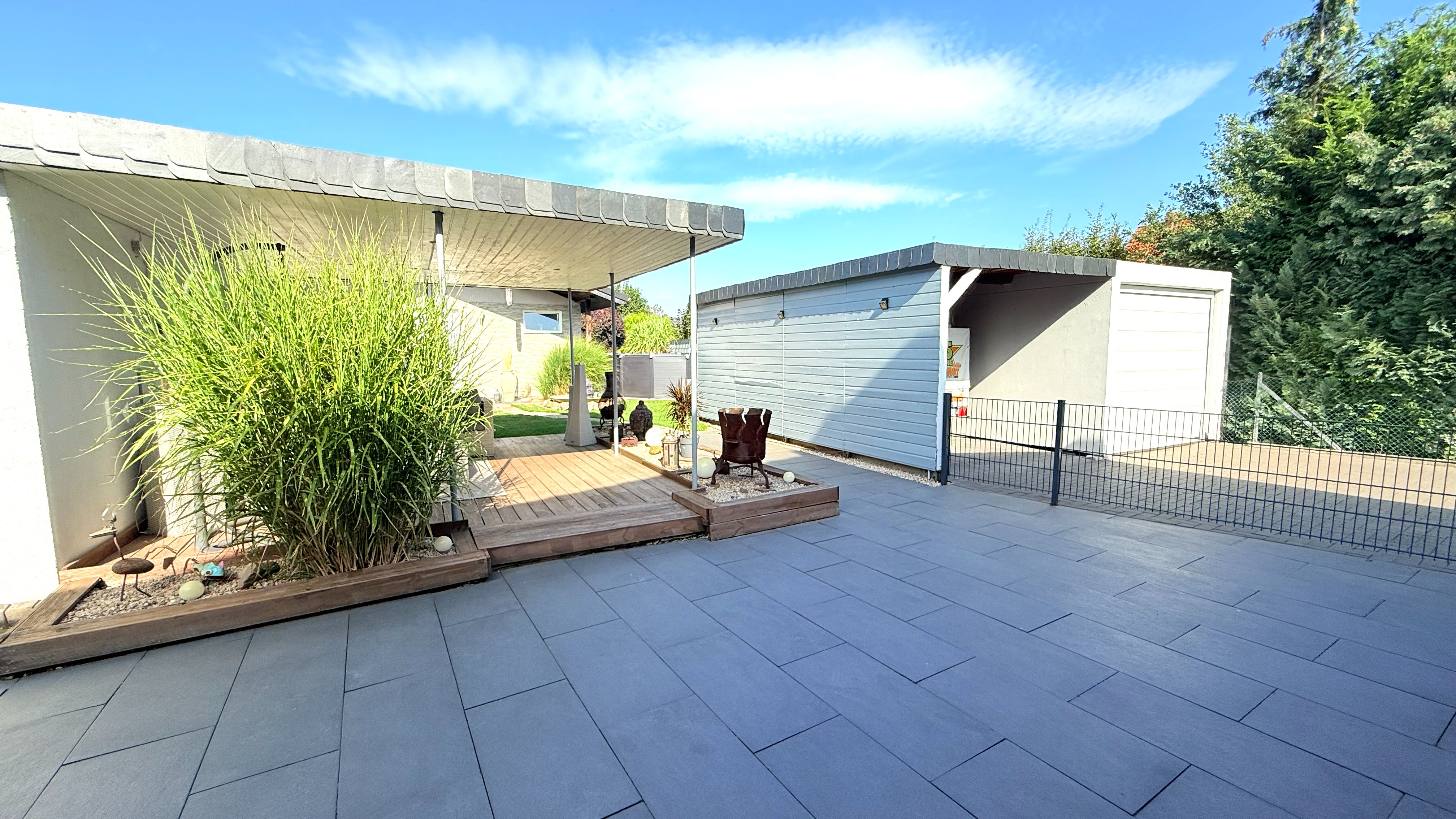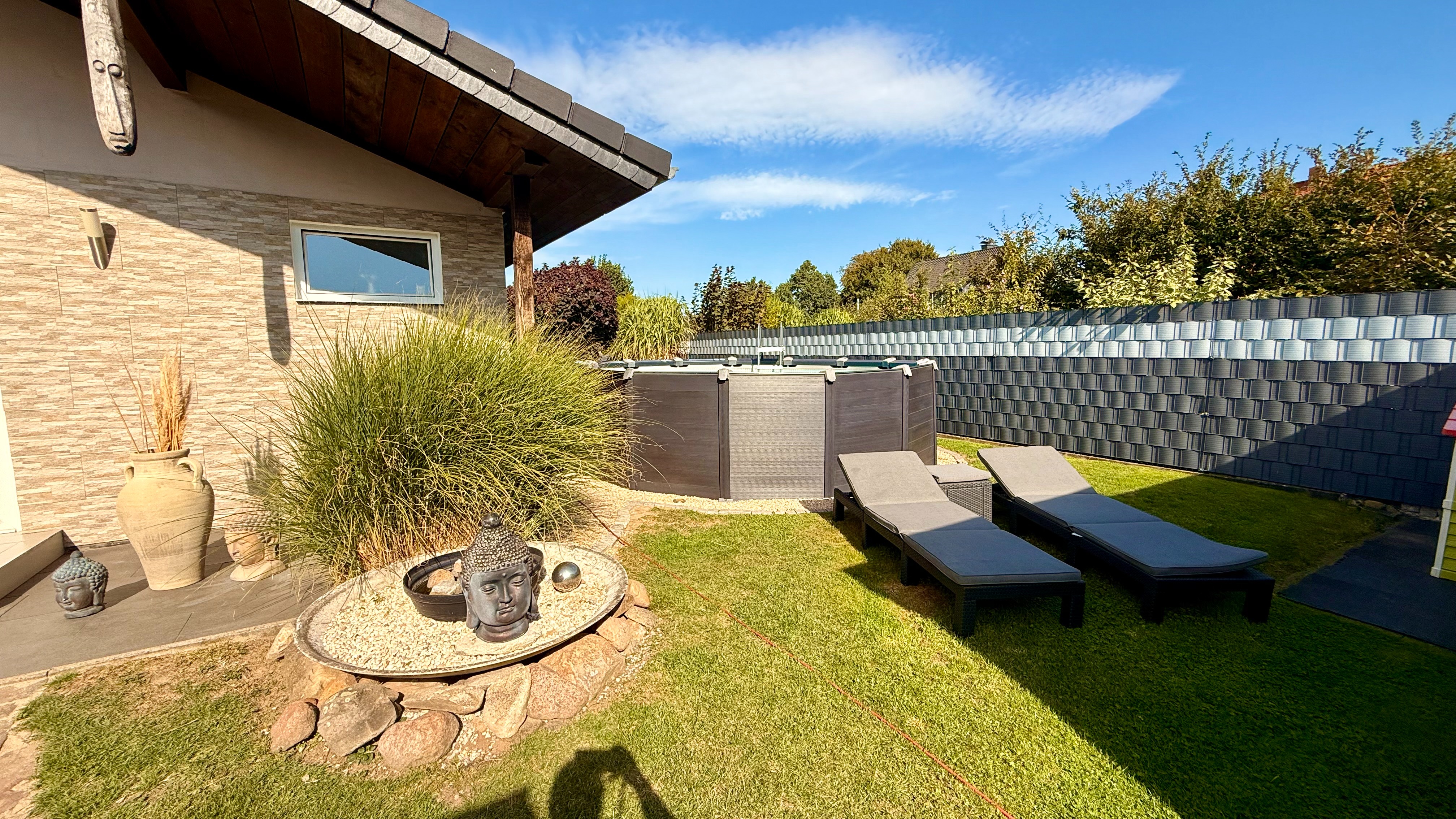 Der Garten ist einfach ein Traum. Auf der oberen Terrasse kann man, dank des hochwertigen Sicherheitsglases, windgeschützt sitzen und auf den schönen Garten blicken. Wunderschön und trotzdem pflegeleicht angelegt, lässt dieses Grundstück kaum einen Wunsch offen. Eine Lounge-Terrasse findet man gleich nahe des Pools, welcher einen Durchmesser von 4,60m und eine Höhe von 1,20m hat. Das gesamte Grundstück ist mit Stabmattenzaun eingezäunt.